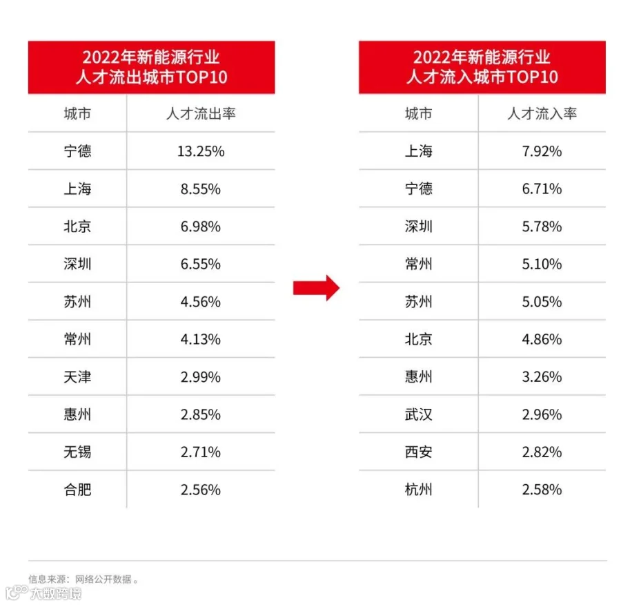 从2022年新能源人才流入城市TOP10看,上海、深圳、北京等一线城市和部分新一线城市像苏州、杭州、天津、无锡等城市流动活跃性较高。