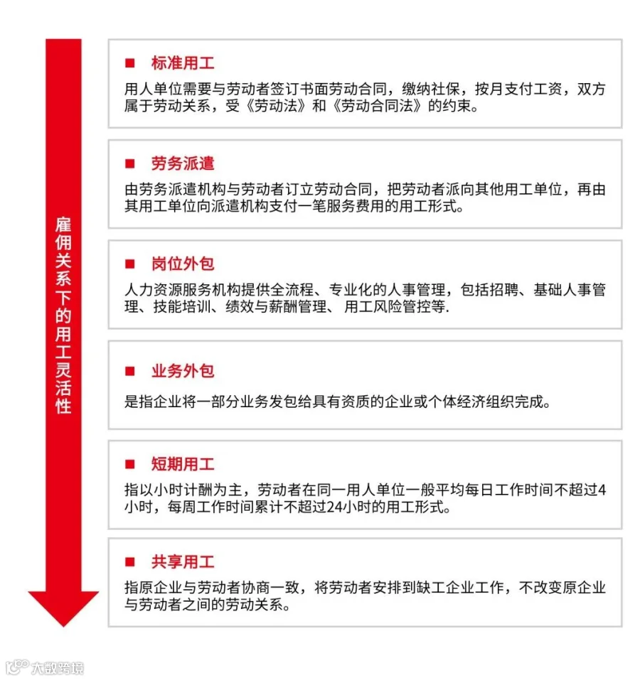 多元化用工除传统标准用工模式外,还包括劳务派遣、岗位外包、业务外包、短期用工、共享用工等多种类型的灵活用工模式,其灵活性体现在劳动时间、收入报酬、工作场地、保险福利、劳动关系等方面的灵活性。实践中要结合企业具体业务类型与岗位类型针对性选择不同用工方式。