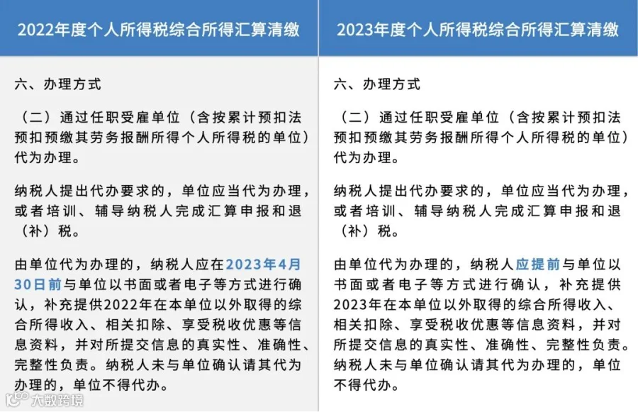 第六条“办理方式”部分,进一步延长汇算代办确认时间。对纳税人有代办需求的,不再要求其必须在4月30日前与单位确认委托关系,为纳税人、单位办理汇算留足更加充分的时间。