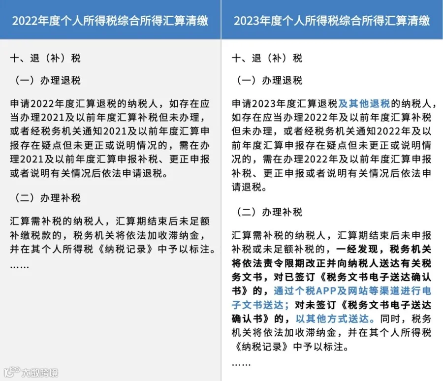 第十条“退(补)税”部分,对未足额申报补缴税款的纳税人,进一步明确了汇算有关文书送达的规定,以督促未申报补税以及未足额缴税的纳税人依法履行纳税义务。