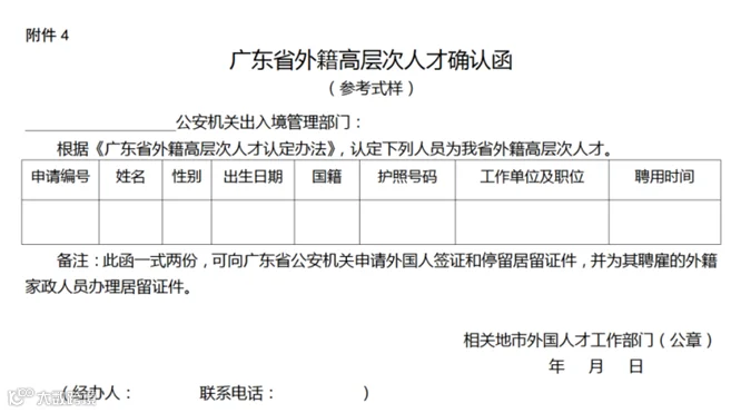 向相关政府部门申请《广东省外籍高层次人才确认函》。有许多外国人认为,自己经营的公司规模很大也获得了不少协会头衔,自认为属于高层次人才。其实不然,高层次人才是需要通过中国相关人才认定部门批准承认,才能获得外籍高层次人才资格。