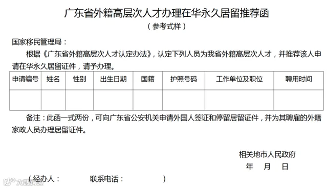 在获得高层次人才的资格后,向政府机关提出申办永居的申请,由政府审核通过后获得《广东省外籍高层次人才办理在华永久居留推荐函》。