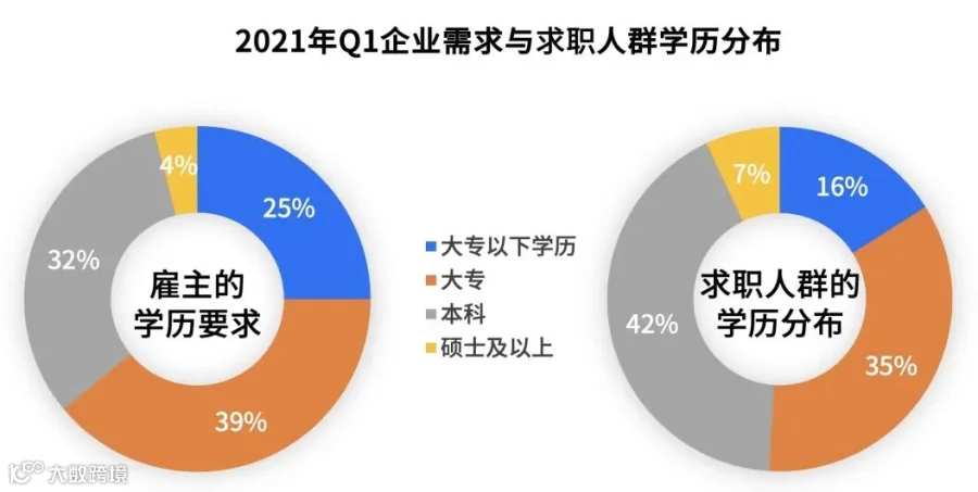 从企业招聘需求看,雇主对学历的要求及求职人群的学历主要以大专及本科为主,占比在80%左右。