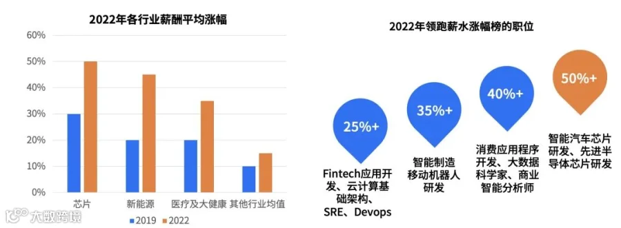 在调研机构Hudson发布的《2022人才趋势报告》中,2022年跳槽薪酬涨幅榜上芯片行业薪水涨幅居首位,超过了50%,Hudson预计2022年领跑薪水涨幅榜的职位排名第一的是智能汽车芯片和先进半导体芯片研发,涨幅50%以上。