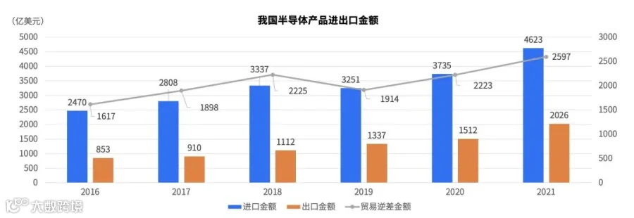 尽管我国芯片产业发展迅猛,但我国芯片供应量与需求量之间的差距过于悬殊,大量的芯片仍然需要通过进口获得。据海关总署统计,2021年我国半导体产品进口金额4623亿美元,出口仅为2026亿美元,进出口贸易差达高2597亿美元,较2020年的2223亿美元再度扩大。