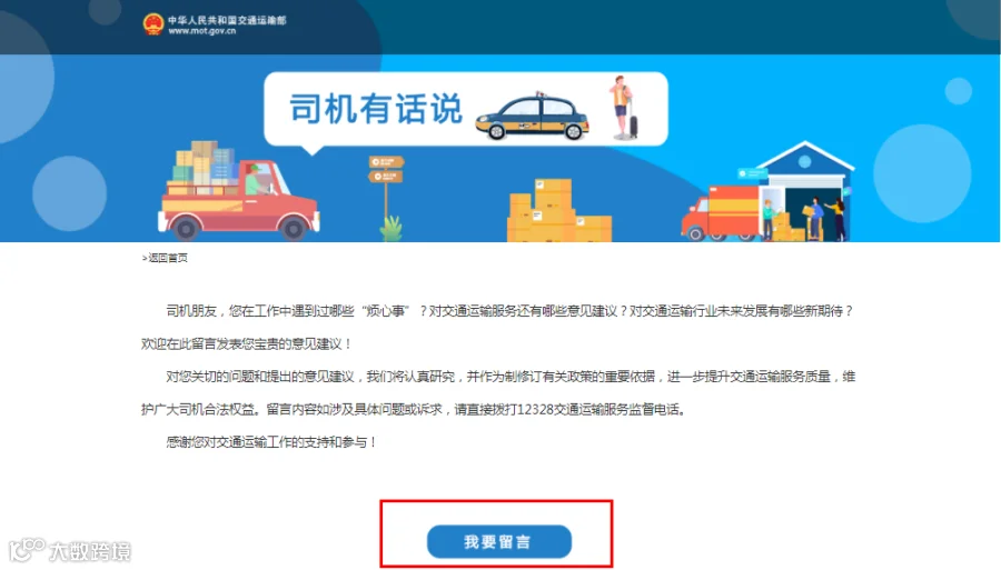 司机朋友,感谢您为交通运输事业付出的辛劳,作出的贡献!交通运输高质量发展离不开您的关心和支持,更需要您建言献策!