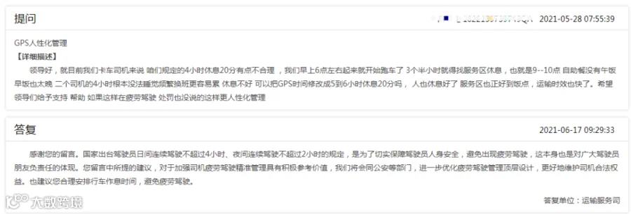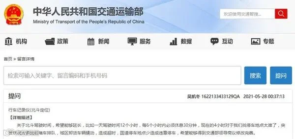 小编在交通部官网上查询了一下,卡友对于疲劳驾驶的意见还是很多的。能否对连续驾驶时间进行一定的延长(例如:一天驾驶时间12个小时,每6个小时内必须休息30分钟),完善该项政策制度。