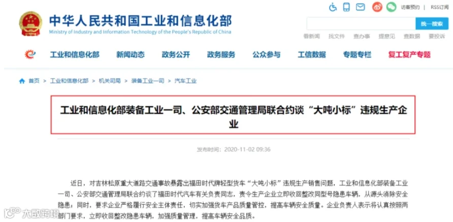 近日,对吉林松原重大道路交通事故暴露出福田时代牌轻型货车“大吨小标”违规生产销售问题,工业和信息化部装备工业一司、公安部交通管理局联合约谈了福田时代汽车有关负责人,责令生产企业立即收回整改同型号隐患车辆,从源头消除安全隐患。