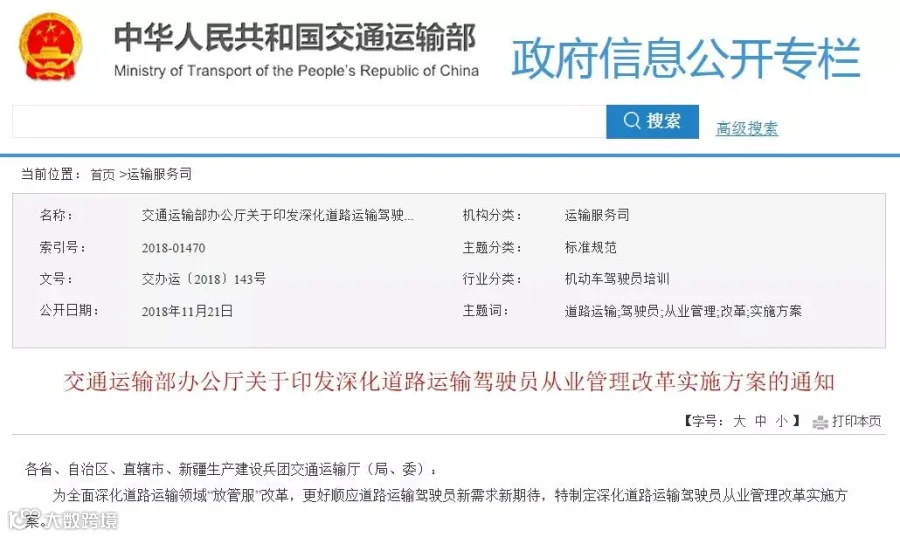 2018年底,交通运输部办公厅印发了《深化道路运输驾驶员从业管理改革实施方案的通知》(后称《通知》),针对道路运输从业资格做出了多方面改革部署,规定所有政策将在2020年之前全部落实。