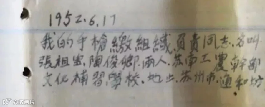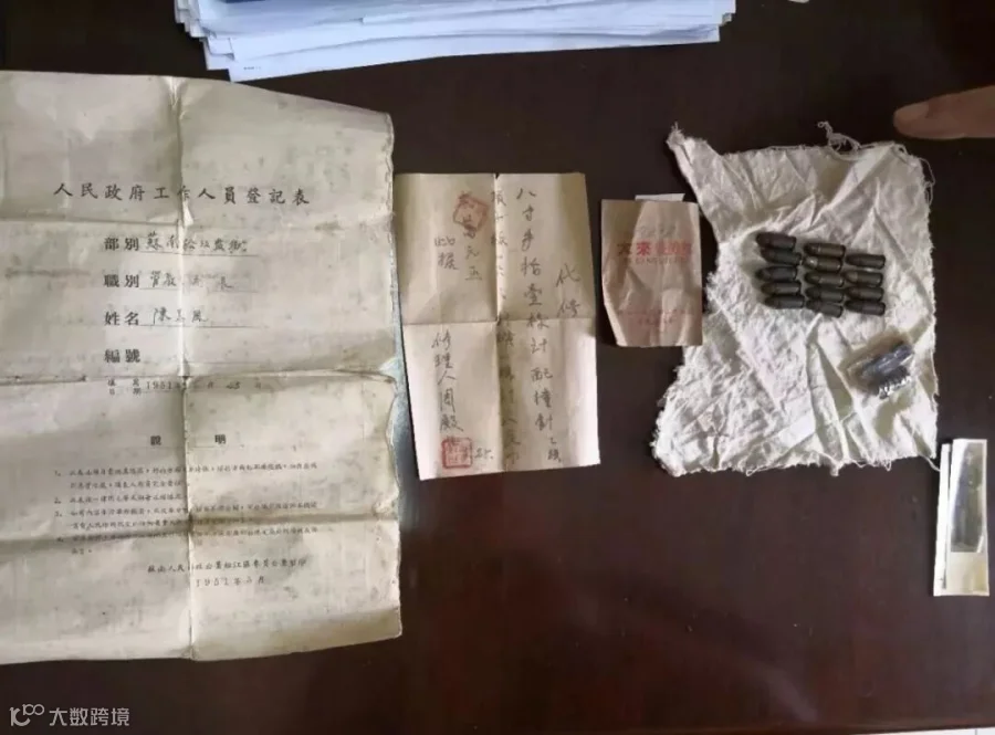 档案记载了时年31岁的陈基风,祖籍浙江余姚,上世纪40年代,他参军并加入共产党,先后参加了淮海战役、渡江战役等。他在战争中屡次负伤,后因身体残疾转入地方工作。上世纪50年代,陈基风在苏南松江监狱任管教长一职。民警推测,手枪疑似陈基风当年所有,因为除手枪之外,还有一份手枪修理收条和1952年6月17日写下的字句:我的手枪缴组织,负责同志名叫张祖宝、陶俊卿两人,苏南工农干部文化补习学校,地址苏州市通和坊。