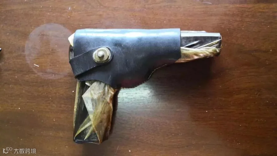 昨天上午一大早,韩先生拎着一个包裹得严严实实的塑料袋,赶到了姜堰区公安局溱潼派出所。民警打开一看,震惊了,竟然是一把用黄油封存着的手枪。手枪外部用塑料纸密封着,还有一个皮套,看起来保存完好。手枪枪口位置印着一排钢印:“上海市公安局”。