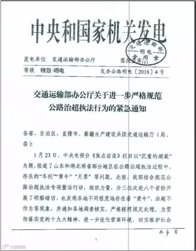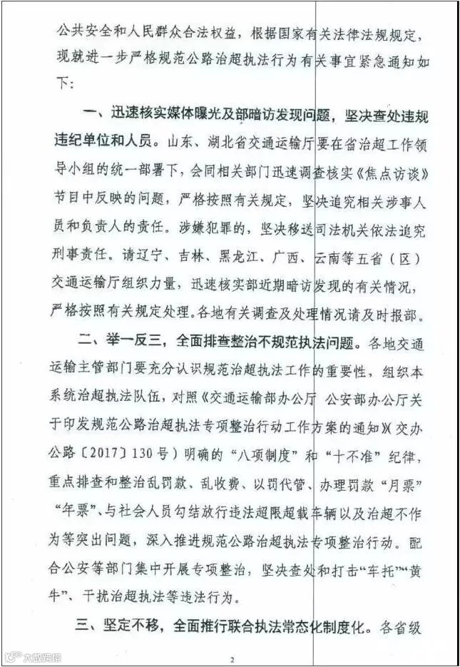 1月23日,中央电视台«焦点访谈»栏目以“沉重的超载'' 为题,报道了山东和湖北两省部分地区在公路治超执法过程中,存在的“车托''“黄牛”“月票”等问题。此前,我部结合规范公路治超执法专項整治行动,组织力量,分三批次赴八个省份开展了明察暗访,也发现各地不同程度地存在着“黄牛”、治超不作为等现象,并通知各地调查核实,严格按照规定处理。为贯彻落实党的十九大精神,进一步优化营商环境,切实维护社会公共安全和人民群众合法权益,根据国家有关法律法规规定,现就进一步严格规范公路治超执法行为有关事宜紧急通知如下;
