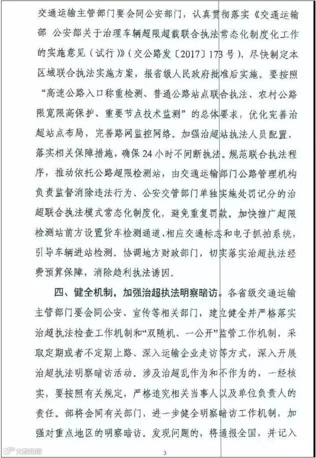 四、健全机制,加强治超执法明察暗访。各省级交通运输主管部门要会同公安、宣传等相关部门,建立健全并严格落实治超执法检查工作机制和“双随机、一公开''监管工作机制,采取定期或者不定期上路、深入运输企业走访等方式,深入开展治超执法明察暗访活动。涉及治超乱作为和不作为的,一经核实,要接照有关规定,严格迫究相关当事人以及单位负责人的责任。部将会同有关部门,进一步健全明察暗访工作机制,加强对重点地区的明察暗访。发现问题的,将通报全国,并记入“十三五”国检考核成绩。