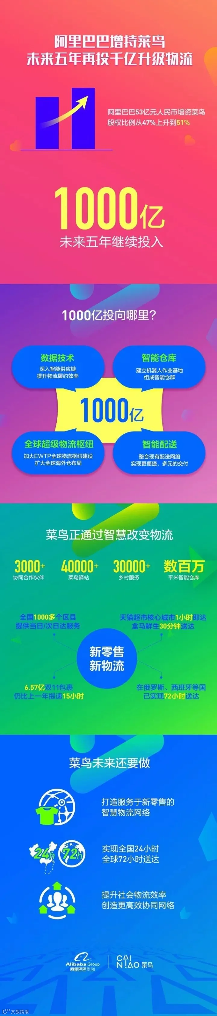 这一次菜鸟的“五年计划”中,千亿资金正是将大力投入智能仓库、智能配送、全球超级物流枢纽等核心领域。