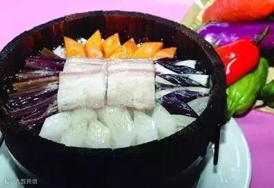 5、土豆、五花肉、南瓜、山蕨、茄子、味料加20克清水调匀,入木桶内摆成形,大火蒸半小时即可。
