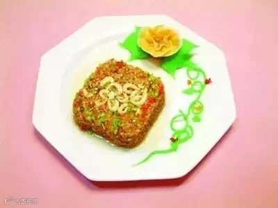 3、锅入色拉油20克,烧至六成热时入豆渣小火炒30秒,入虾米末、干贝末、香菇末、冬笋末、蒜末小火翻炒1分钟,下青、红辣椒末小火翻匀,用盐、味精、鸡精、胡椒粉、辣椒粉调匀,淋香油出锅,装入碗中压实,将碗倒扣在盘中,用蒸熟的面花点缀。