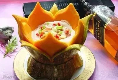 原料:鱼籽200克,鱼泡100克,鱼膏(即鱼油,和鱼子连在一起的部分)50克,白萝卜丝50克,青蒜20克,大蒜10克,芹菜段10克,干辣椒3克,南瓜容器1个
