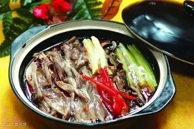 1、麻鸭切重25克的块,入锅小火干炒3分钟,倒入香油小火炒3分钟,再入黄酒、土酱油小火炒3分钟,加陈醋、麦芽糖和800克清水小火翻炒1分钟后用盐、味精、胡椒粉调味,取出装入瓦罐中。