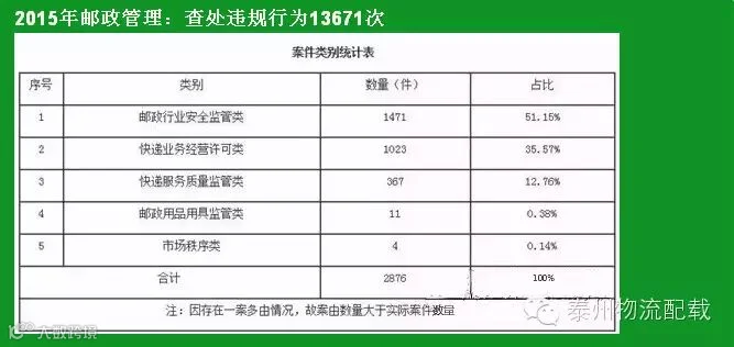 数据显示,全国邮政管理部门2015全年共下达行政处罚决定2801份,五类行政处罚案件及数量依次为:邮政行业安全监管类1471件,快递业务经营许可类1023件,快递服务质量监管类367件,邮政用品用具市场监管类11件,市场秩序类4件。而按照处罚种类统计,全年各级邮政管理部门共作出警告51次,罚款2562次,责令停产停业218次,吊销许可证5次。