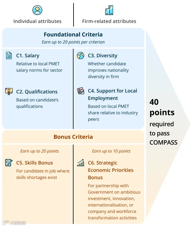 薪资门槛仅为入场资格的一部分。EP申请人除满足Stage 1最低薪资外,还需通过Stage 2的COMPASS互补专才评估框架,在薪资、学历、企业多元化、本地雇佣支持等维度累计达到40分方能获签。