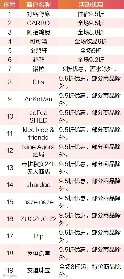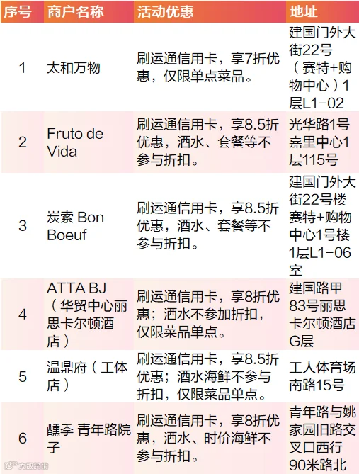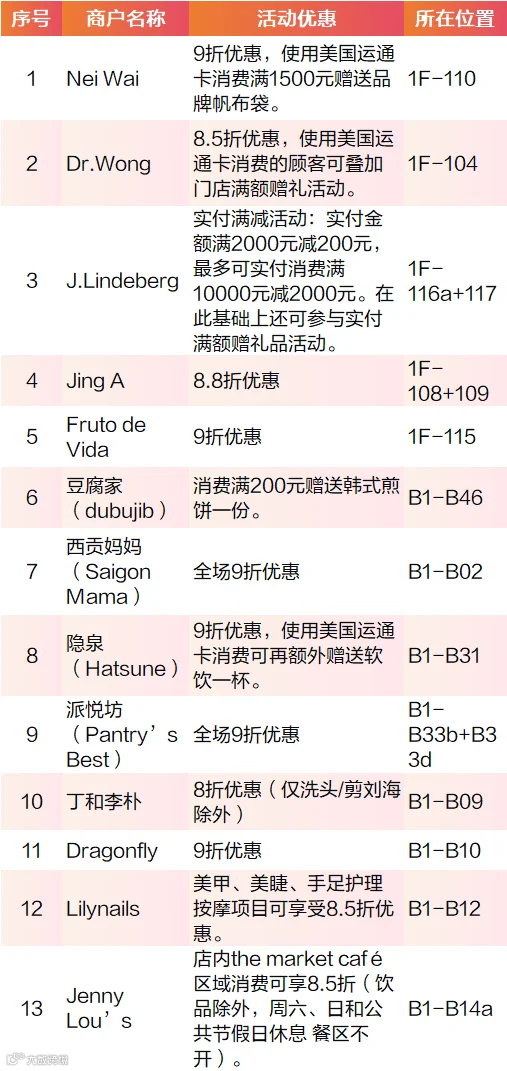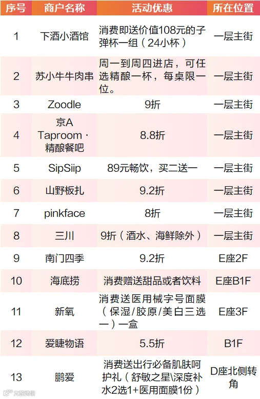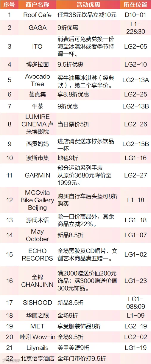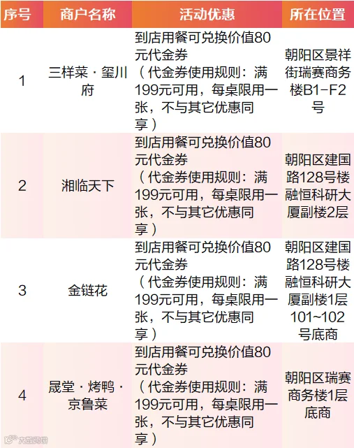 国贸商城、秀水街、中骏世界城、北京嘉里中心、赛特+购物中心、侨福芳草地、北京友谊商店、景祥街128号品质餐饮街区等8大商业体百余家门店参与,覆盖餐饮、服饰、酒店、影院、医美及家居等多元业态,提供一站式消费体验。