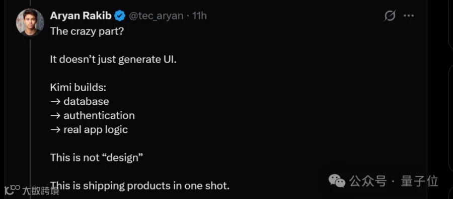 博主评价称:"这不是演示代码,是能直接交付的代码。"相较于传统工作流程需要设计师、前端和产品经理协同作业,Kimi K2.6仅需单个提示即可完成全流程交付。