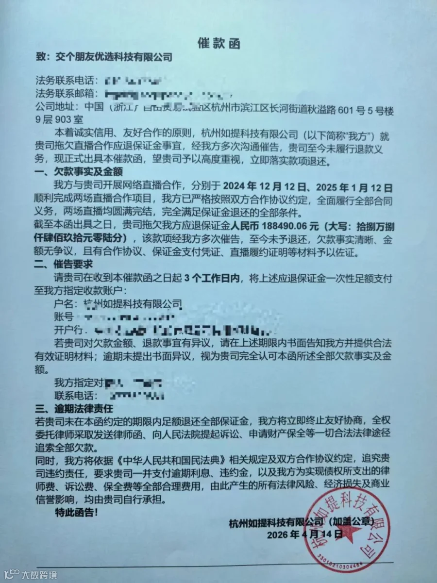 近日,杭州如提科技有限公司(简称“如提科技”)投诉称,该公司向遥望网络、交个朋友等头部直播机构预付专场费用后,直播销售远未达标、补播承诺未兑现,累计欠款超26万元。目前如提科技已发催款函,若对方仍拖延退款,将依法维权。
