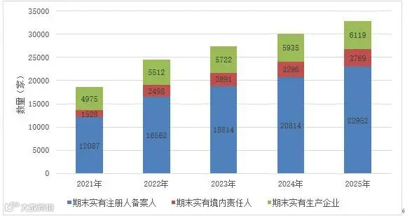 图1 2021-2025年化妆品注册人备案人、境内责任人和生产企业数据