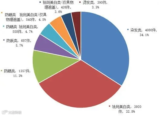 批准注册申请20162件:国产92.2%、进口7.7%。首次注册59.3%(国产广东等五省占95.1%)、变更38.4%、延续2.3%(图10)。产品类型:染发34.1%、祛斑美白32.8%、防晒11.3%(图13)。近5年批准66648件(图14)。
