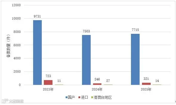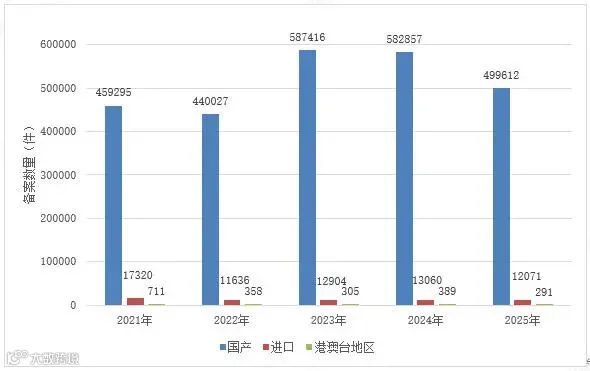 2025年新增注册人备案人2331家、境内责任人485家、生产企业480家(含牙膏26家)。截至2025年底,全国共有注册人备案人22952家、境内责任人3769家、生产企业6119家(含牙膏308家)。2021-2025年数据见图1。