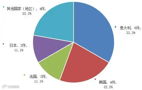 新增备案公示新原料169个(国产88.8%、进口10.7%、港澳台0.6%)。国产备案前5省份:广东、上海、浙江、北京、山东,占比67.9%(图2);进口备案前4国家:意大利、韩国、法国、日本,占比77.7%(图3)。近5年备案376件,国产占83.5%(图4)。