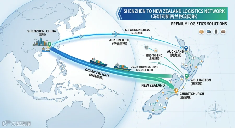 覆盖奥克兰、惠灵顿、基督城等新西兰主要城市,提供门到门全程服务。