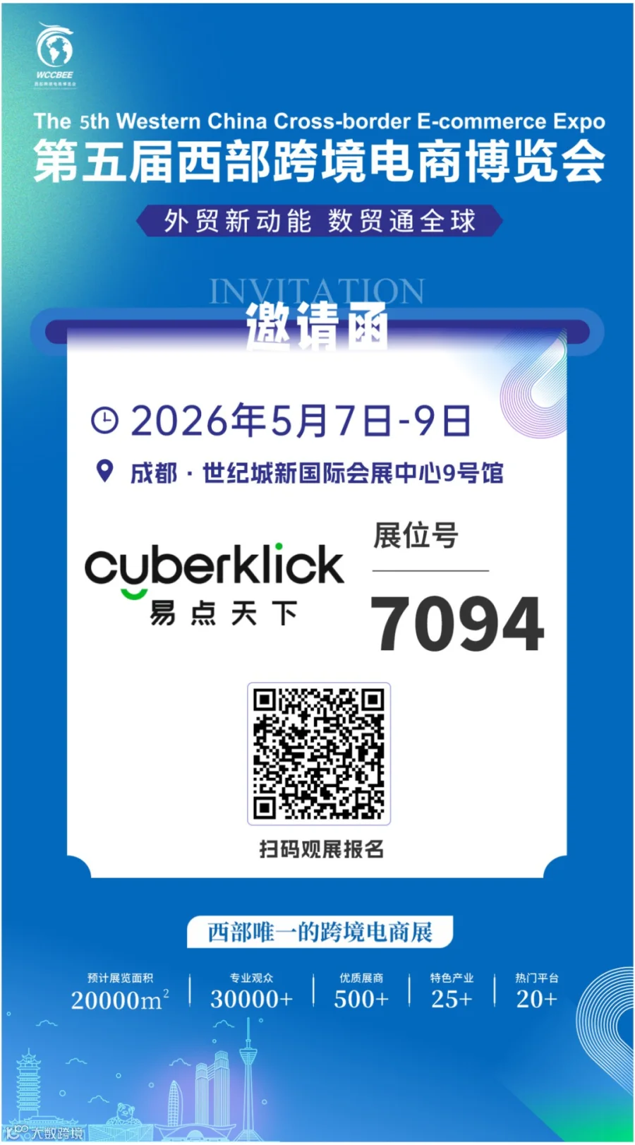 2026年5月7日至9日,第五届西部跨境电商博览会暨成都跨交会在成都世纪城新国际会展中心9号馆启幕,主题聚焦"外贸新动能·数贸通全球"。易点天下旗下品牌Cyberklick将携数字化营销策略亮相7094展位,助力跨境电商企业稳健发展。
