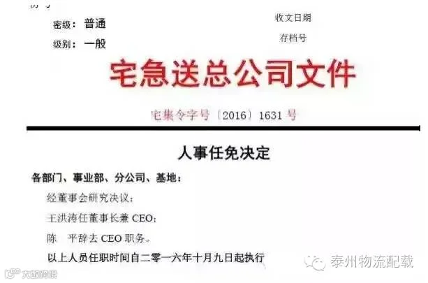 10月9日消息,宅急送陈平将再度卸任CEO一职。宅急送将同时任命原泰康资产管理公司股权投资部总经理王洪涛为董事长兼CEO,原CEO陈平卸任后将继续作为宅急送董事会顾问。
