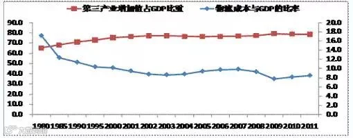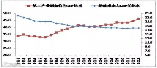 根据美国的历史数据进行分析表明,在美国,第三产业增加值占GDP的比重每上升1个百分点,物流成本与GDP的比率下降约0.6个百分点。