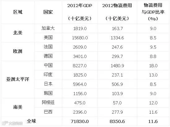 全球主要国家或地区物流费用及其与GDP的比率(2012年)