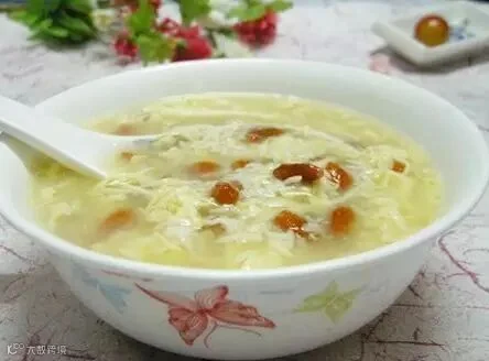 先将200克酒酿煮开,然后依次加入枸杞、适量冰糖和50克搅拌均匀的鹌鹑蛋蛋液,最后大火煮开即可。