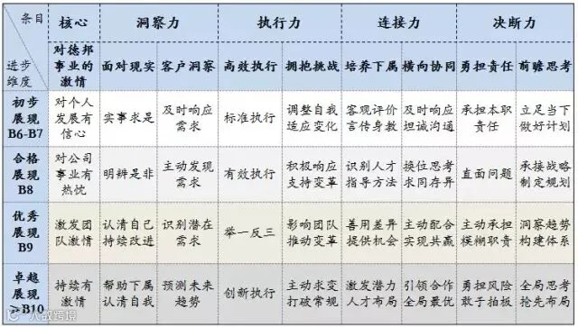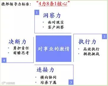 一个优秀的德邦领导者应以“对事业的激情”为核心,在洞察力、执行力、连接力、决断力方面都有很好的表现。另外,每个“力”都还包含着两格要求。以“四力”中的洞察力为例:一是要面对现实。干部要对自己有理性清楚的认识和判断,能正视自身不足,并能够持续改进;二是要进行客户洞察。干部以客户为中心,通过对德邦战略、业务或外部市场、行业的分析与理解,识别、挖掘和满足客户的需求。