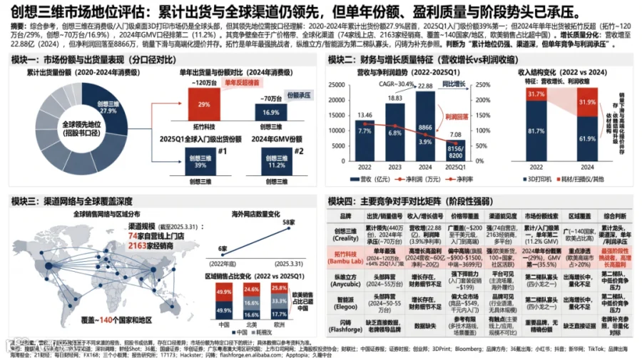 从经营结果来看,这种策略成效显著。2020年至2024年间,创想三维以27.9%的全球累计出货量份额稳居行业头部,并在2025年Q1继续保持入门级市场份额第一。