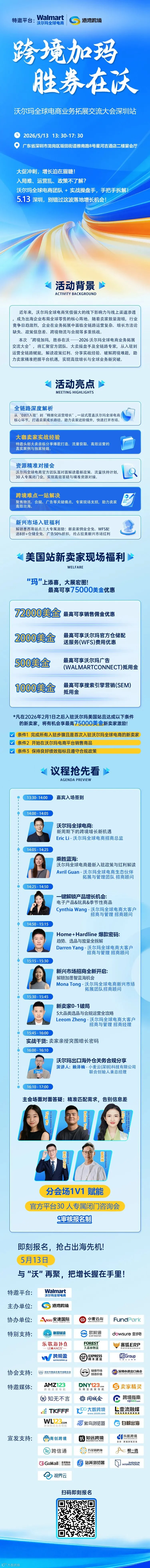 5月13日,我们将在深圳星河吉酒店举办【跨境加码·胜券在沃-沃尔玛全球电商业务拓展交流大会】欢迎各位朋友前来交流!