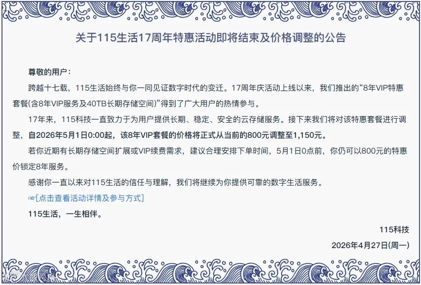 根据115网盘官方发布的通知,其8年VIP套餐即将涨价。这次价格调整从2026年5月1日零点开始,套餐价格将从目前的800元上调至1150元,上涨了350元。