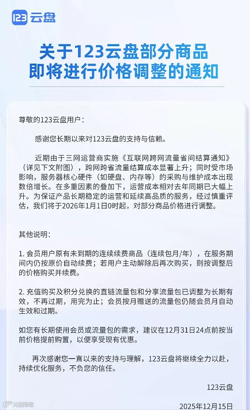 早在2025年12月,123云盘就率先打破了行业的平静,宣布自2026年1月1日起上调部分会员和流量包价格。官方指出,涨价原因在于运营商跨网流量结算成本上升以及服务器硬件采购成本数倍增长。