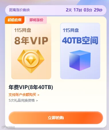 这个8年VIP套餐是115网盘17周年庆期间推出的优惠活动,因其高性价比而备受关注。