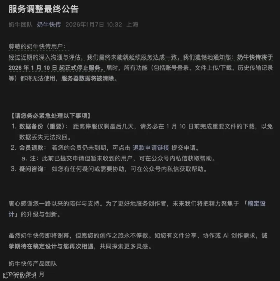 以运行了10年的奶牛快传为例,尽管其在2025年11月首次宣布停服后曾因并购意向暂缓,但最终仍于2026年1月10日全面停止服务。奶牛快传的关停是常态,其复活反而是小概率事件。