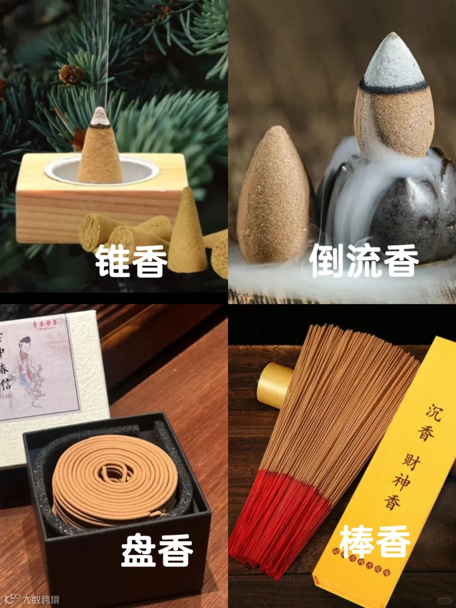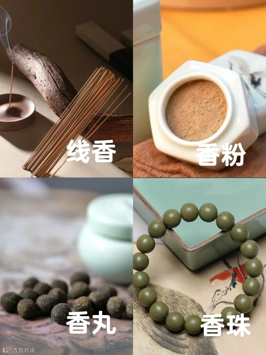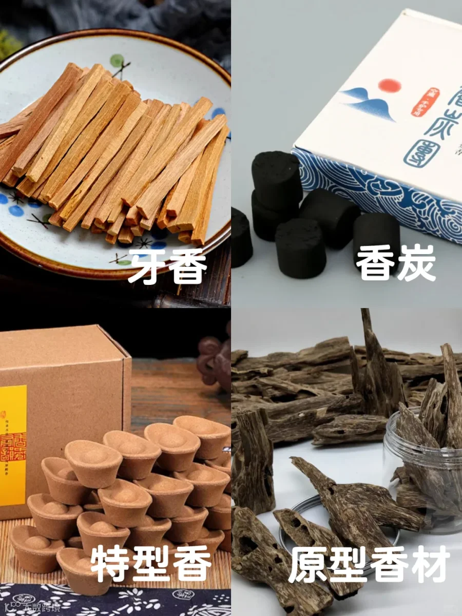 香炭:又称为"木炭香",通常呈块状或粉末,由木炭和香料混合制成。这种香通常直接置于香炉燃烧。