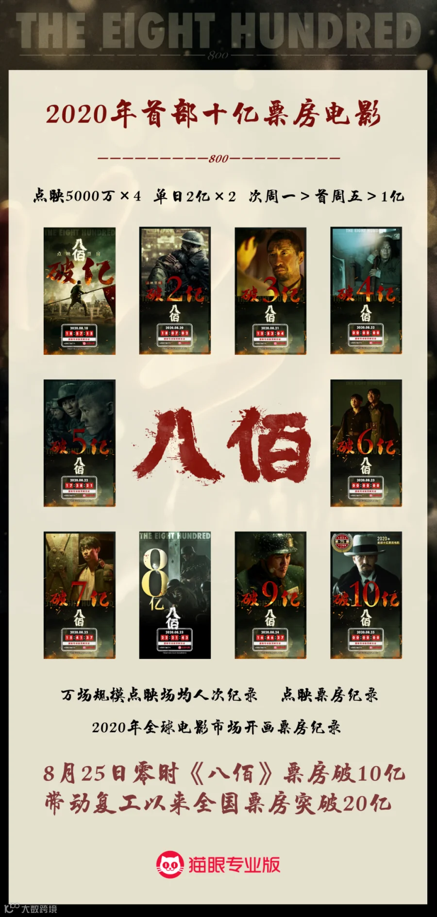 8月25日零时,《八佰》总票房破10亿,成为2020年首部十亿票房电影,距离上一次有影片拿到10亿票房的成绩,还要追溯到2019年贺岁档双雄《误杀》和《叶问4:完结篇》,两部影片于今年1月上半月携手迈过十亿大关,226天过后,中国电影市场再度迎来十亿重磅作品,在电影院复工的第六周,《八佰》等影片正在持续推动大盘节节攀升。