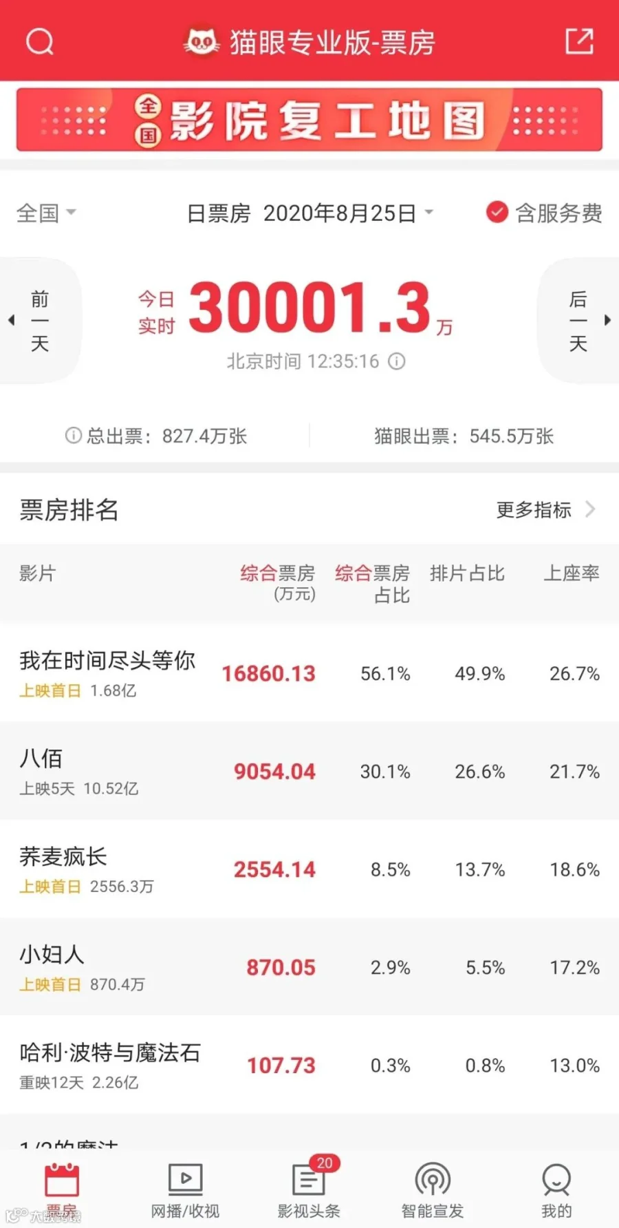 12时35分,今日全国票房已突破3亿大关,《我在时间尽头等你》《荞麦疯长》《小妇人》等七夕档影片与《八佰》携手将大盘推升至又一久违高度,这也是2020年全国单日票房首次突破3亿关口。在九千余家影片复工的现今,全国单日票房产值已可超越2019年跨年档的单日3.36亿,振奋人心!