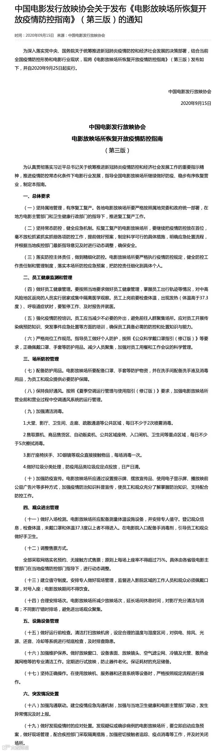 9月15日,中国电影发行放映协会发布《电影放映场所恢复开放疫情防控指南(第三版)》(下文简称《指南》)。《指南》在“观众进出管理”一项中明确提出电影放映场所原则上每场上座率不得超过75%,并要求合理安排场次,减少放映场次,延长场间休息时间等。这也意味着影院复工后的上座率上限进一步被提高。该《指南》将于9月25日起实行,将适用于当日上映的《夺冠》以及后续国庆档影片。
