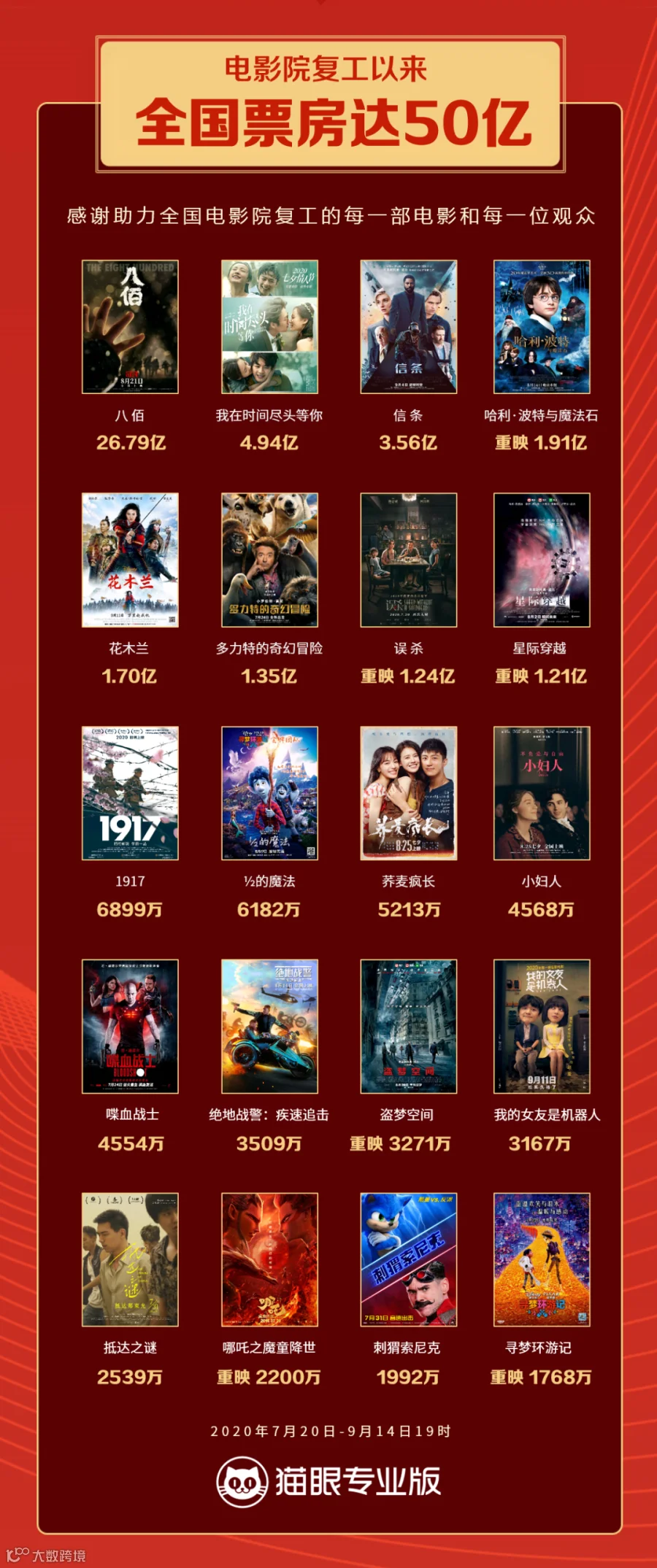 据此前猫眼专业版的数据显示,在影院复工之初,全国影院复工率只有11.4%。影院复工22天,票房也才5.8亿,平均单日票房仅2600万。而随着新影片如《八佰》《信条》的上映,令影院市场快速回温。而在57天的50亿票房中,仅就以《八佰》单片以26.79亿人民币贡献超半数票房,与《我在时间尽头等你》《信条》《哈利波特与魔法石》《花木兰》五部影片位列票房榜前五。另外《误杀》《星际穿越》等重映老片票房也成功突破了1亿。
