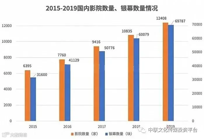 而观影需求的强烈,其实也是这些年来影院与荧幕快速发展的一个基础。据国家电影专资办统计,从2015年到2019年,全国影院数量从6395家影院增长至12408家,每年呈现正增长趋势。数据显示,2019年全国影院数量是2015年的2倍。随着影院数量的增加,我国电影院银幕数也不断增加,从2015年的全国31600块银幕增长至2019年的69787块,平均增长率为22%。